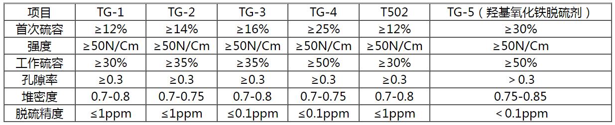 项目 | TG-1 | TG-2 | TG-3 | TG-4 | T502 | TG-5(羟基氧化铁脱硫剂) |