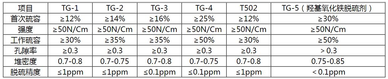 项目 | TG-1 | TG-2 | TG-3 | TG-4 | T502 | TG-5(羟基氧化铁脱硫剂) |